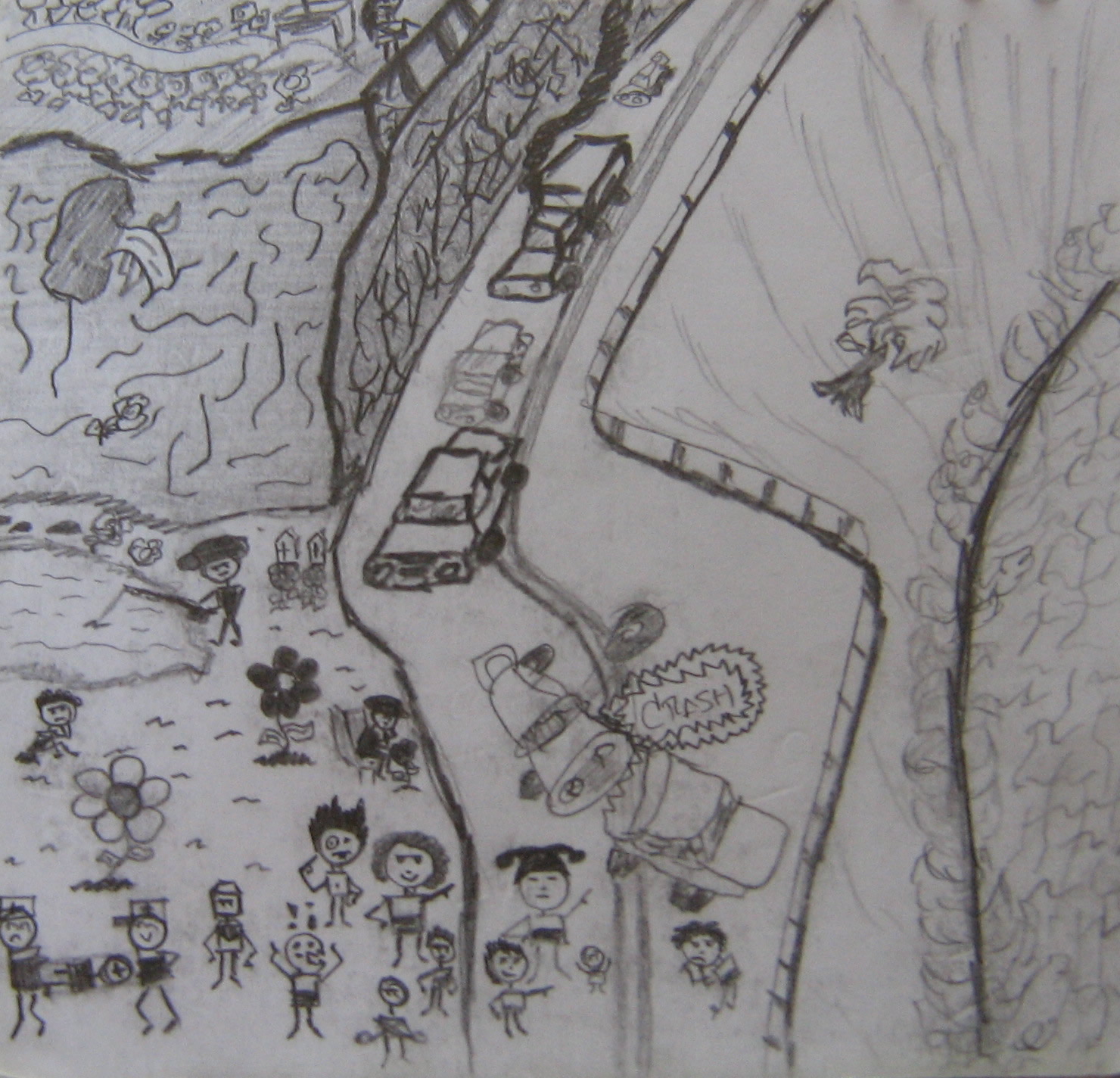 ¿Por qué? Ese día deseaba un buen motivo para no llegar a mi aburrida clase (esta vez de metodología) lamentablemente no pasó nada. El dibujo hace referencia a la salida libre a Cuernavaca, no es que yo pase por allí seguido pero recuerdo los fantásticos accidentes que me contaban mis amigos que viven cerca de la zona.